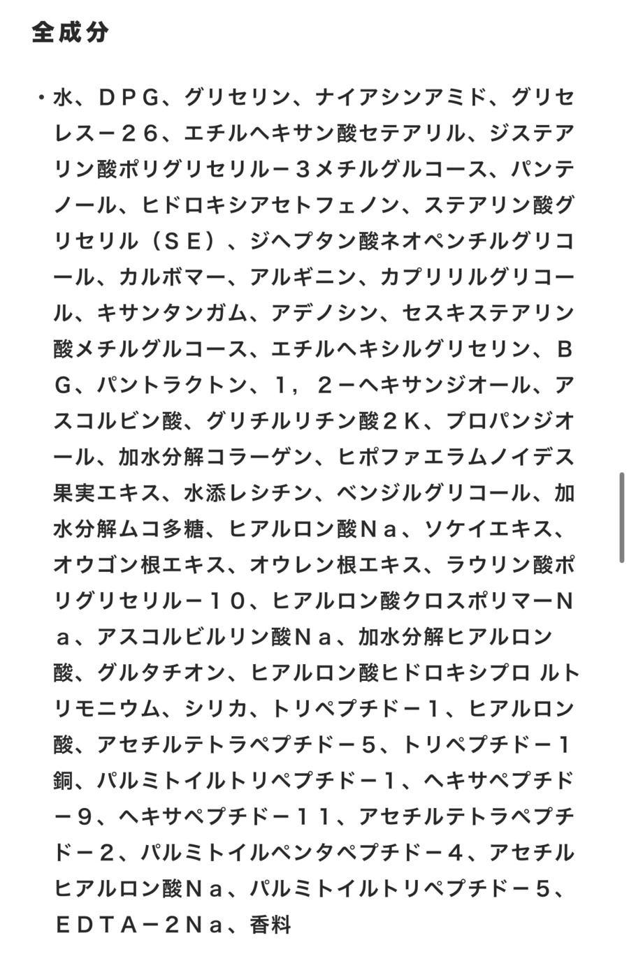*4 トリペプチド-1、アセチルテトラペプチド-5、トリペプチド-1銅、パルミトイルトリペプチド-1、ヘキサペプチド-9、ヘキサペプチド-22、アセチルテトラペプチド-2、パルミトイルペンタペプチド-4、パルミトイルトリペプチド-5(配合目的:肌コンディショニング剤)